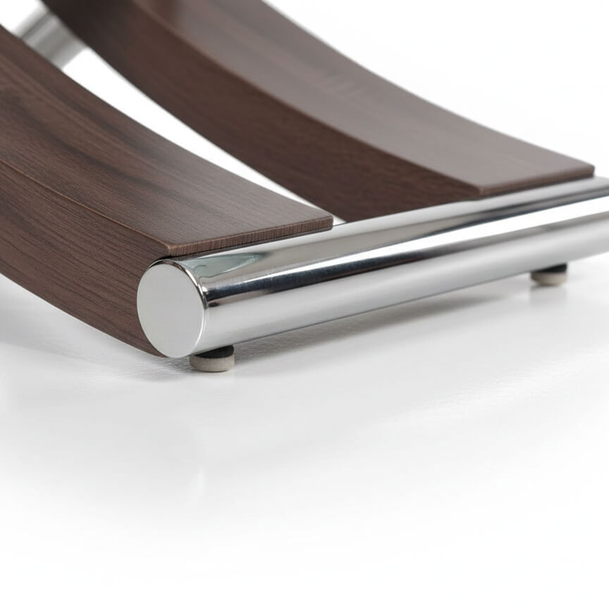 Το μυστικό της κατασκευής του είναι ο έξυπνος συνδυασμός. Οι καμπυλωτές φόρμες που μοιάζουν με σκούρο ξύλο είναι στην πραγματικότητα κατασκευασμένες από ανθεκτικό ανοξείδωτο ατσάλι με ειδική επένδυση, προσφέροντας την ομορφιά του ξύλου με την ασυναγώνιστη αντοχή του μετάλλου. Αυτό, σε συνδυασμό με τα γυαλιστερά ατσάλινα στηρίγματα, δημιουργεί ένα κομψό και απίστευτα στιβαρό σύνολο.