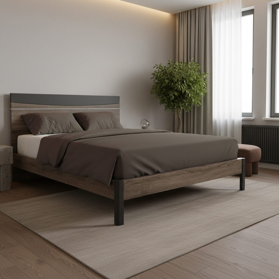 Upgrade your bedroom with the Eirini wooden minimal bed, ideal for a modern and elegant decoration. This bed is made of MDF wood with a veneer finish, offering a durable and aesthetically pleasing solution for your space. The wooden legs of the bed add a natural and modern feel to your room.