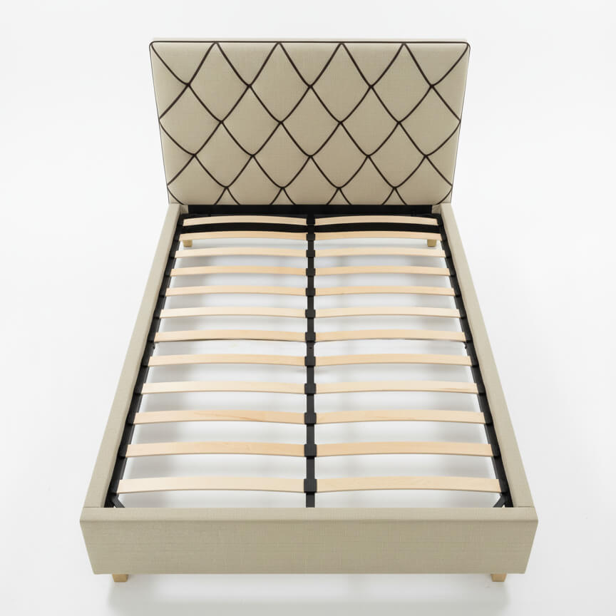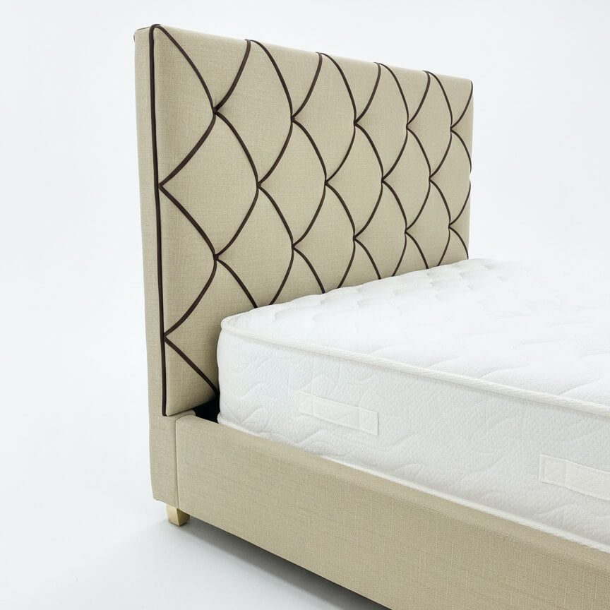 Upgrade your bedroom with the Ira Upholstered Double Bed, an elegant piece that adds a sense of luxury and style to your space. The double bed has a quilted design on the headboard and beautiful brown lines that create a unique aesthetic effect. The beige color of the bed offers a warm and welcoming atmosphere.