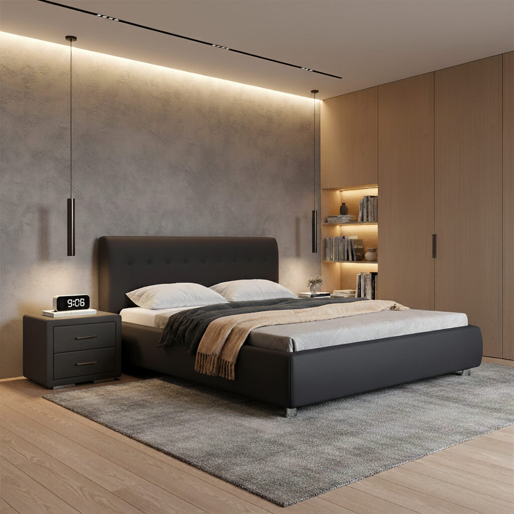Upgrade your bedroom with the modern Galini bed, an elegant piece that adds a sense of tranquility and style to your space. The bed features a subtle quilted design on the headboard, offering a luxurious yet understated look that suits any modern bedroom.
