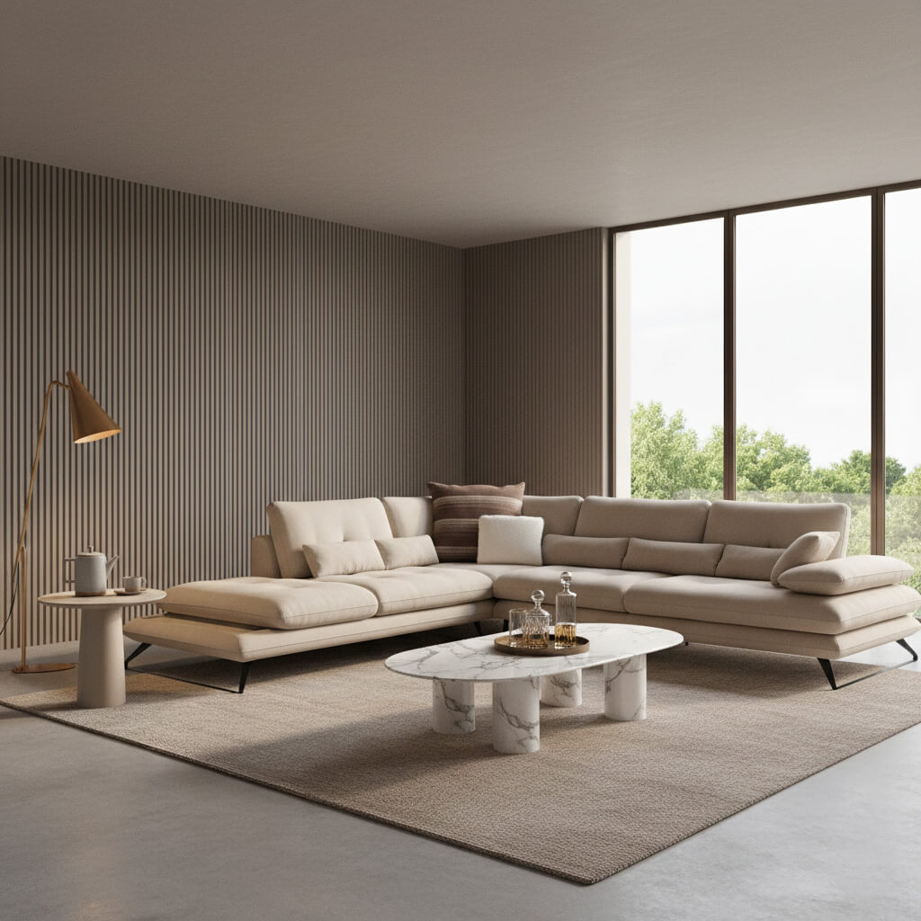 The modern Ermes corner sofa, with its modern and elegant design, is the ideal modern choice for any living room. Made from durable, waterproof materials, this sofa is extremely easy to clean and maintain, offering long-lasting durability and performance. Its back cushions are removable, allowing them to be adjusted for comfort and flexibility in your space.