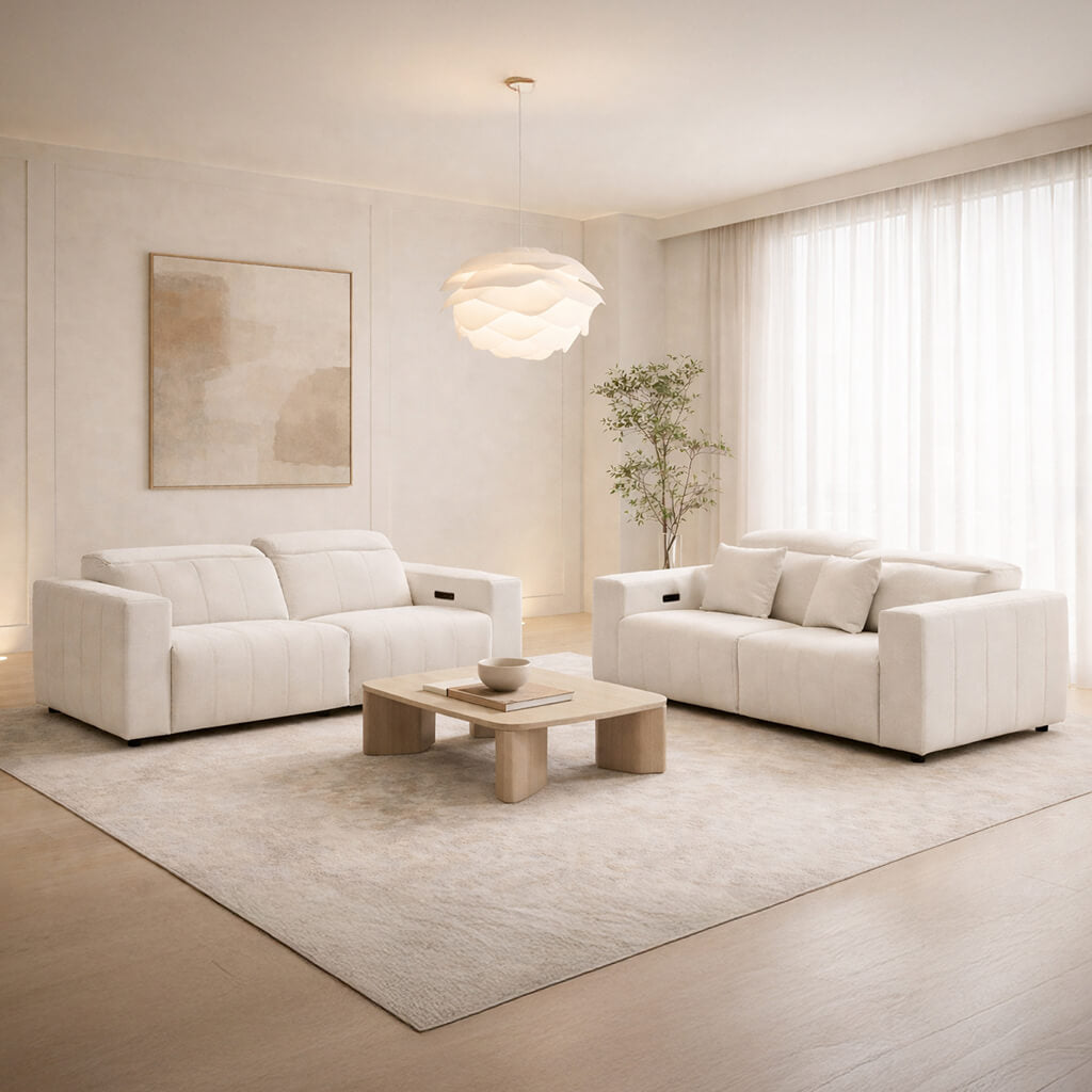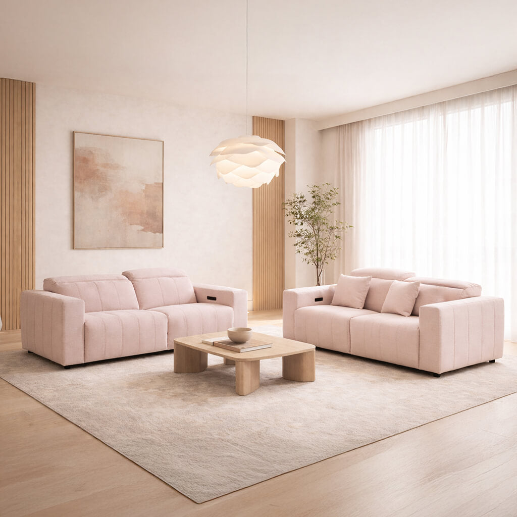 The Bianca sofa set consists of a three-seater and a two-seater sofa, both equipped with a reclining mechanism. The design combines subtle elegance and functionality, ideal for modern and timeless spaces.