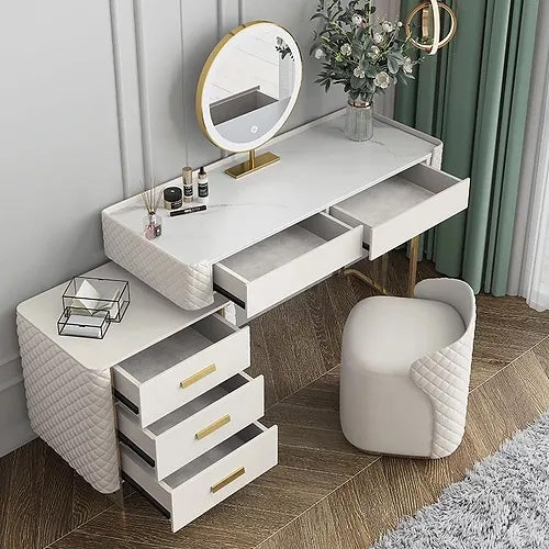 This mirrored vanity offers ample storage space with three large drawers, ideal for storing cosmetics and accessories. The contemporary design and gold-tone details add a sense of simplicity and elegance to your decor.