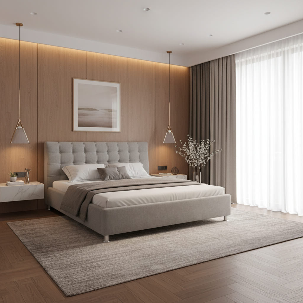 Обновите вашу спальню с помощью обитой современной серой кровати Электра, обладающей высоким эстетическим уровнем и красивой стеганой спинкой.Это кровать обита льняной тканью, которая легко чистится и придаёт вашей комнате элегантный и современный вид. Светло-серый цвет и стёганый узор на изголовье кровати добавляют штрих роскоши и стиля.