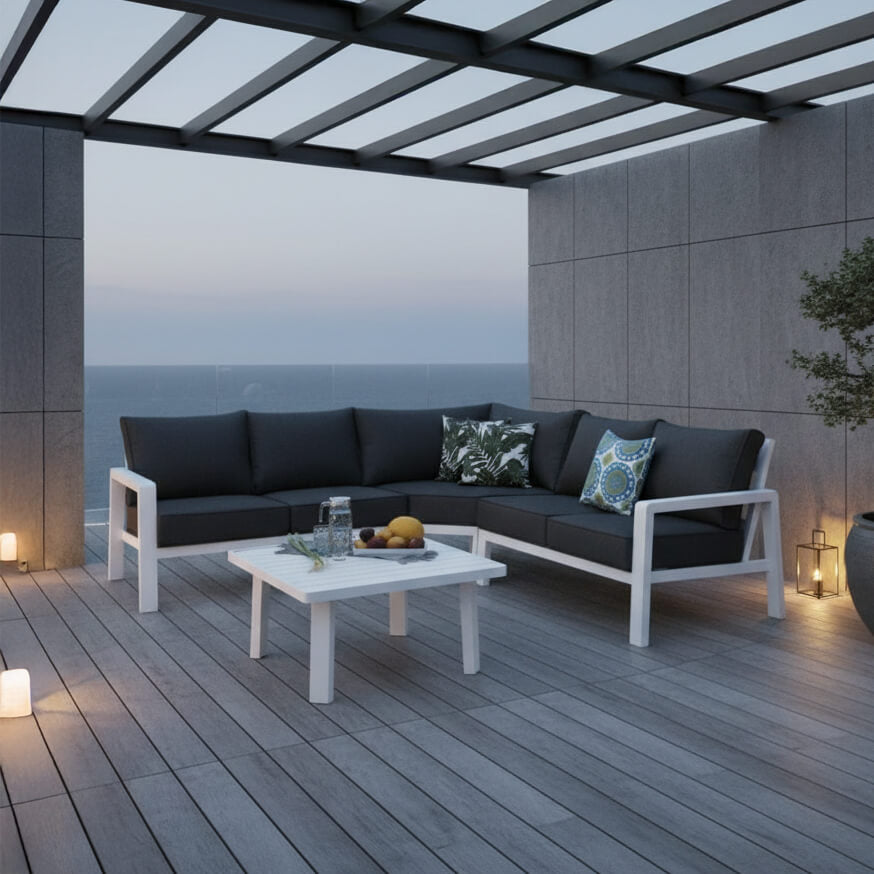 O γωνιακός καναπές εξωτερικού χώρου Κρήτη διαθέτει στιβαρό σκελετό από αλουμίνιο σε χρώμα λευκό, προσφέροντας ανθεκτικότητα και μακροχρόνια χρήση. Ο αλουμινένιος σκελετός είναι ανθεκτικός στη διάβρωση, καθιστώντας το ιδανικό για χρήση σε εξωτερικούς χώρους.